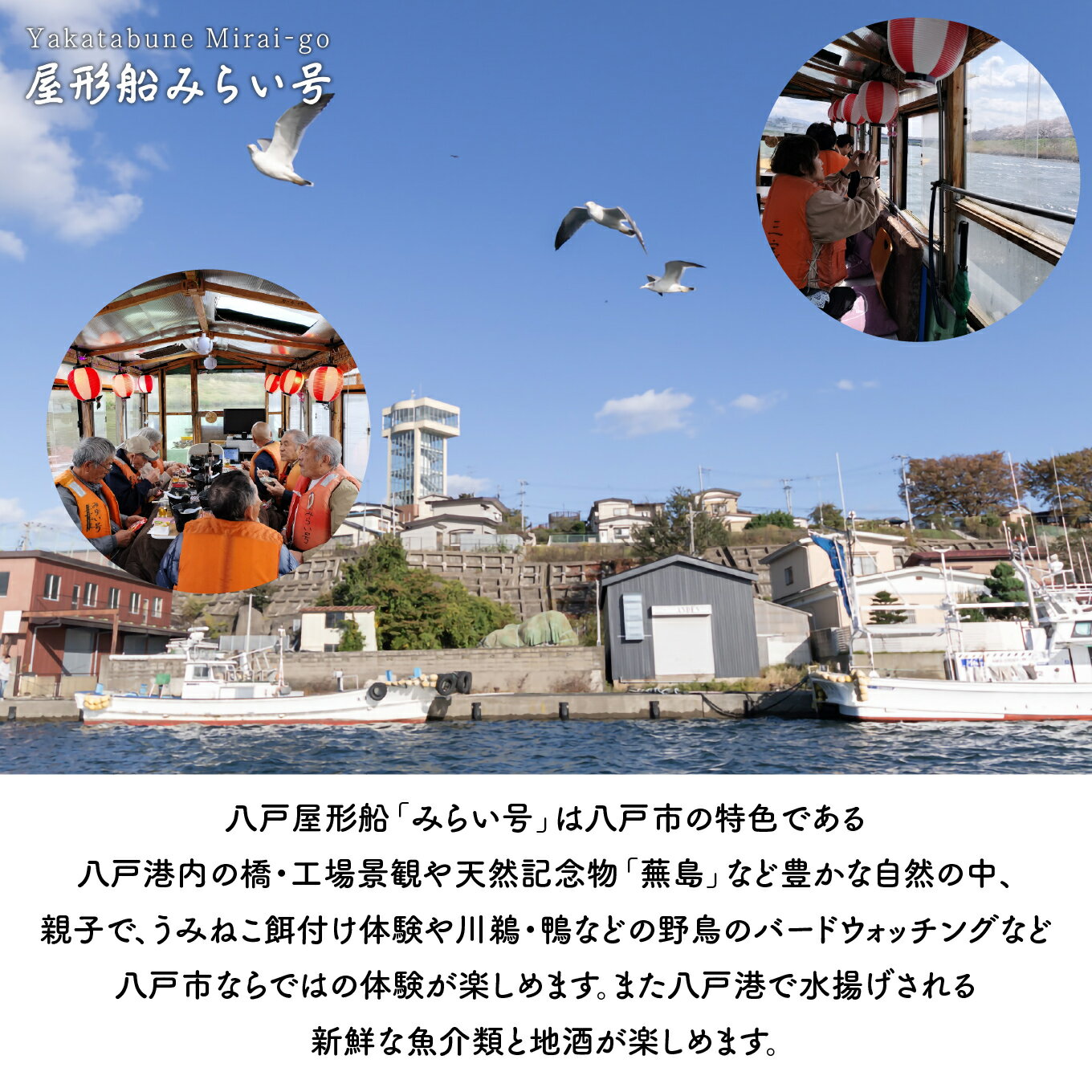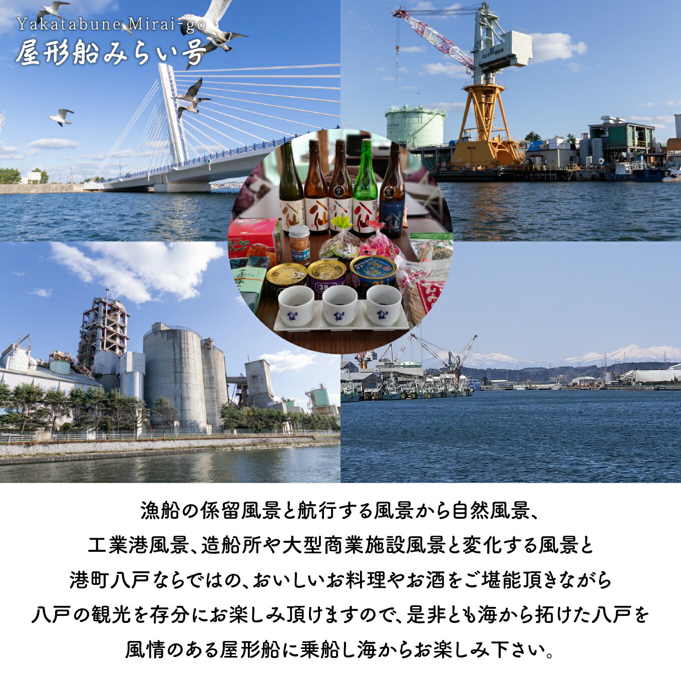- 【ふるさと納税】みなとオアシス八戸 <青森県で唯一の屋形船> 酒蔵利き酒と八戸港内ランチ・クルーズ 【お料理:八戸の人気お土産品、昼】 チケット 4名分 新鮮魚介類 うみねこ餌付け体験 バードウォッチング 青森県 八戸市