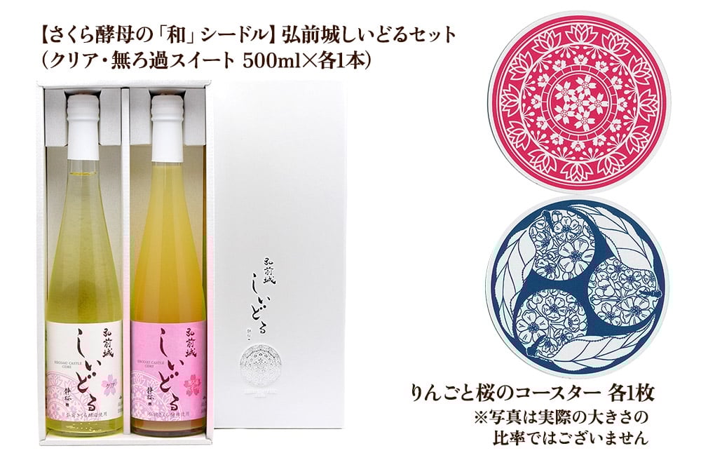 - 【寄附金額見直しました】【さくら酵母の「和」シードル】弘前城しいどるセット(クリア・無ろ過スイート 500ml×各1本)&りんごと桜のコースター 各1枚