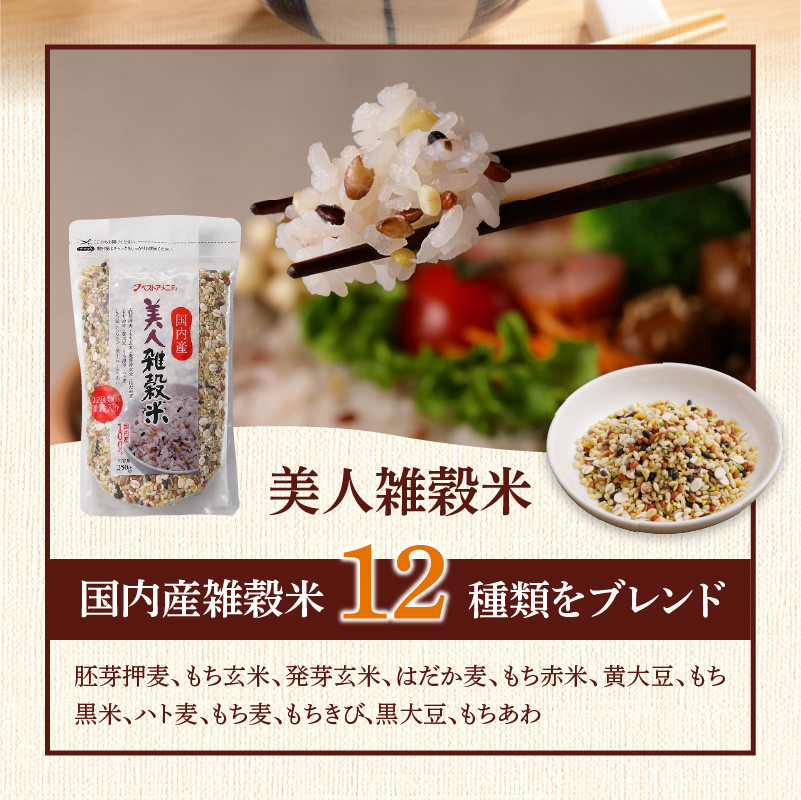 国内産 美人雑穀米 250g×6個_雑穀米 国内産 250g × 6個 選べる お届け回数 1回 3回 6回 美人雑穀米 雑穀 12種 ブレンド 混ぜて炊くだけ 冷めても美味しい 胚芽押麦 もち玄米 発芽 玄米 もち黒米 ハト麦 もち麦 もちきび 黒大豆 もちあわ 簡単 主食 おにぎり 弁当 ふっくら もちもち