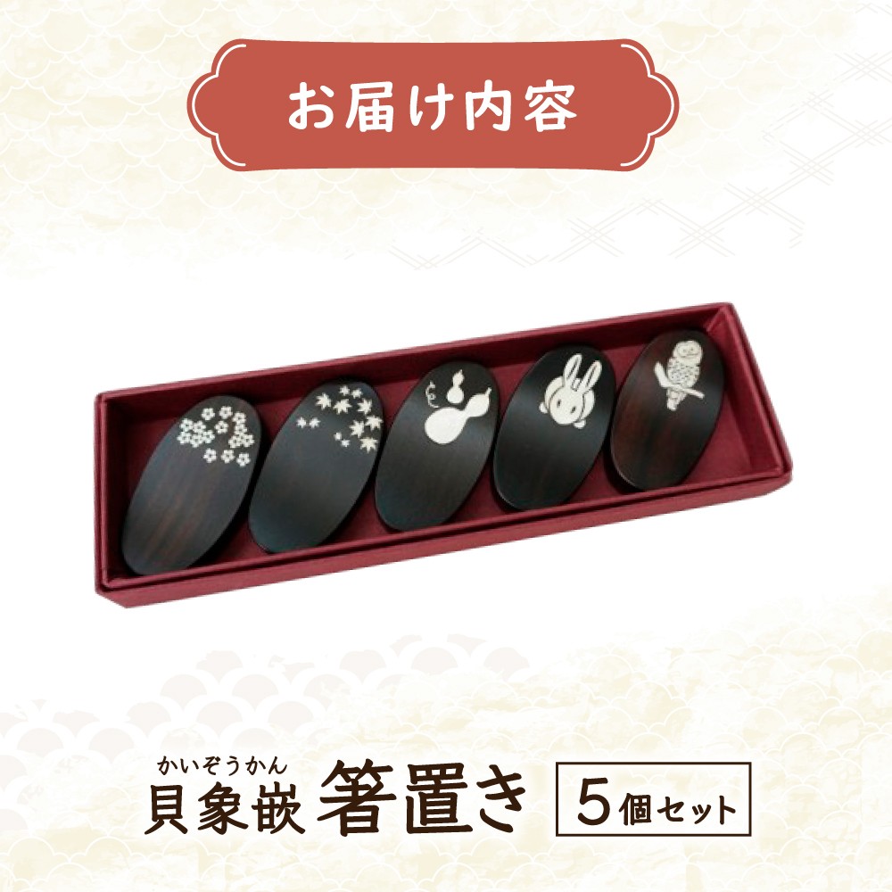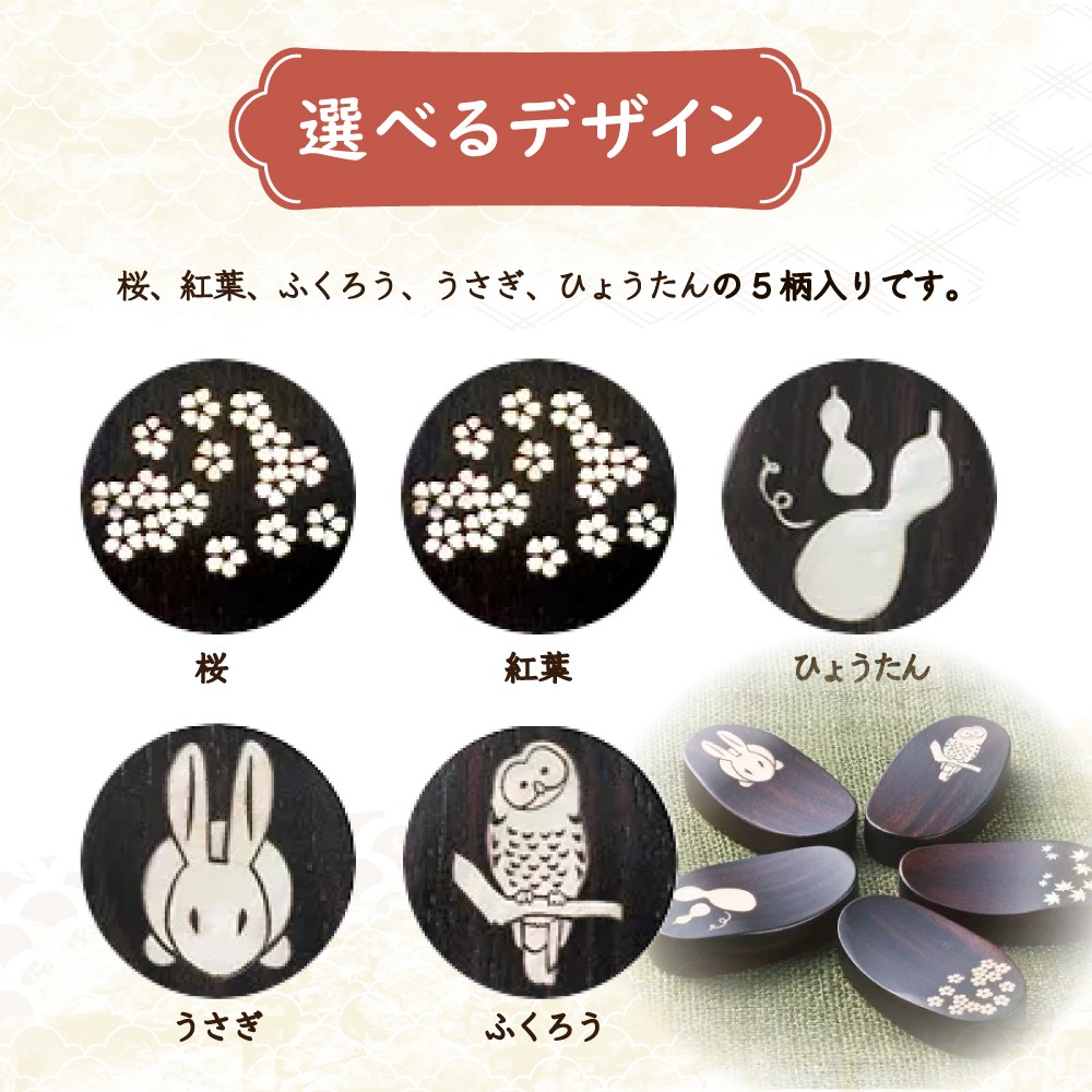 - 貝象嵌 黒壇 箸置き 5個セット 木製 木工品 岩手県 北上市 (E0307)ハンドメイド 贈り物 プレゼント ギフト お祝い 記念品 工芸品 インテリア かわいい うさぎ 桜 ひょうたん 紅葉 木細工 夢工房