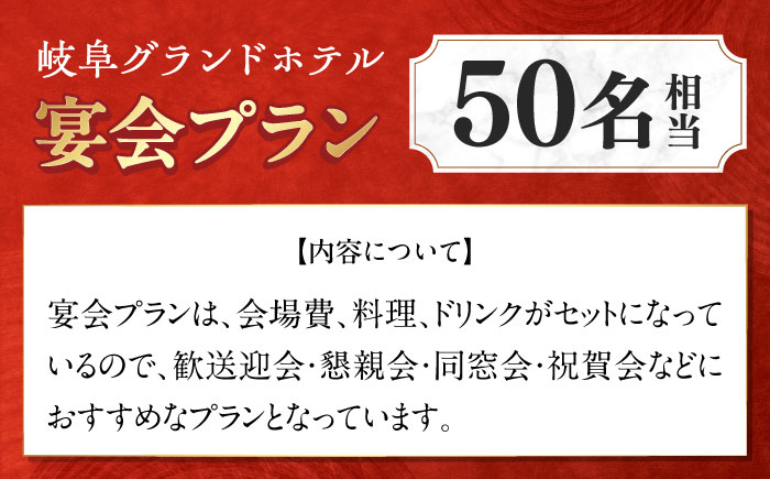 岐阜グランドホテル 宴会プラン(50名相当) チケット 利用券 食事券 パーティー 飲み会 懇親会 忘年会 新年会 歓送迎会 同窓会 祝賀会 会食 宴会 ホテル ビュッフェ 和食 洋食 フレンチ 中華 和食 フリードリンク ドリンク お酒 酒 飲み放題 団体 岐阜 金華山 長良川 観光 おすすめ 人気 ギフト プレゼント 岐阜市 / 岐阜グランドホテル [ANFM005]