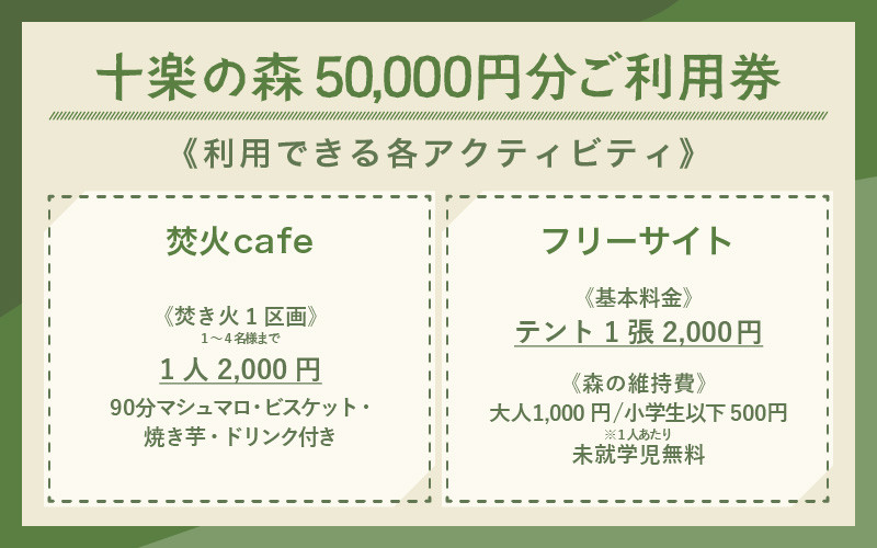- 「十楽の森」 50,000円分 利用券 <キャンプ・BBQ・ドッグラン・飲食楽しめる施設> / あわら 体験 チケット 施設 アウトドア グランピング バーベキュー 道具 レンタル テント ノルディスク