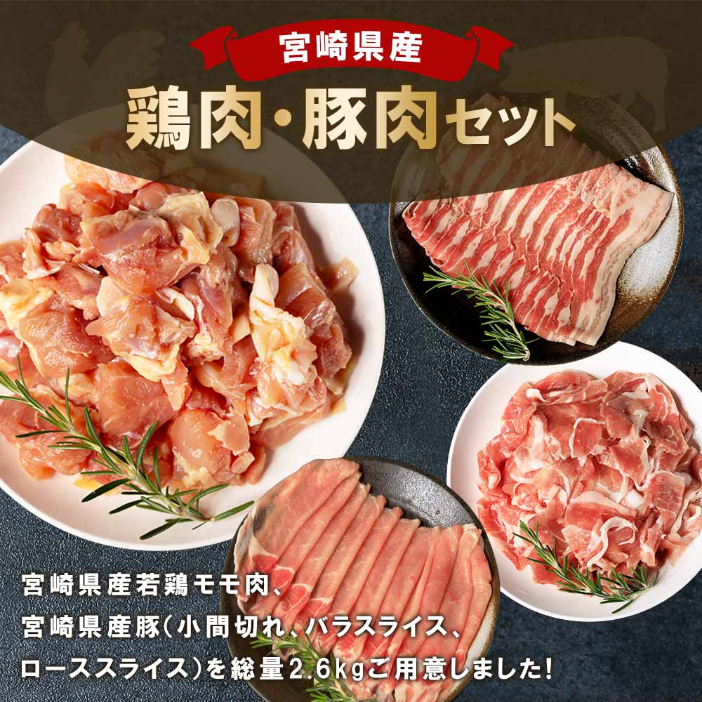 <宮崎県産の鶏肉と豚肉セット (総量2.6kg)>若鶏もも肉一口カット(400g×2P),豚小間切れ(200g×3P),豚バラ肉スライス(200g×3P),豚ロース肉スライス(200g×3P)【MI116-mk】【まきの屋】