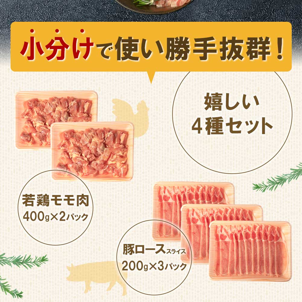 - <宮崎県産の鶏肉と豚肉セット (総量2.6kg)>若鶏もも肉一口カット(400g×2P),豚小間切れ(200g×3P),豚バラ肉スライス(200g×3P),豚ロース肉スライス(200g×3P)【MI116-mk】【まきの屋】