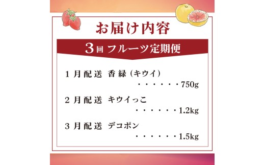 - 旬のフルーツ 定期便 3回 Iコース 果物 フルーツ デコポン 不知火 柑橘 みかん 蜜柑 香緑 キウイ キウイフルーツ キウイっこ グリーンキウイ スイーツ デザート ケーキ ゼリー ジュース ジャム アイス ジェラート フルーツ大福 クレープ ふるさと納税定期便 ふるさと納税フルーツ ギフト 贈答 送料無料 ふるさと納税 香川県 丸亀市