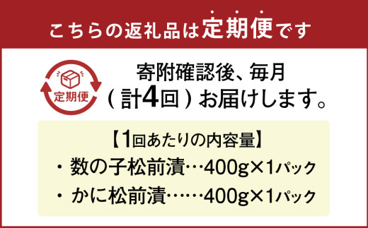 【4回定期便】 プチプチ食感の数の子松前漬とずわい蟹のかに松前漬セット 各400g (合計3.2kg) 4回 松前漬 松前漬け 数の子 魚卵 ずわい蟹 ズワイガニ かに カニ 蟹 海鮮 海の幸 セット 定期便 北海道 小樽市 冷凍 送料無料