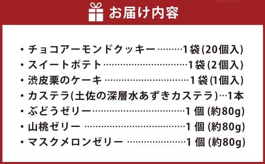 ホワイトハウス(セットC) チョコアーモンドクッキー スイートポテト 渋皮栗のケーキ カステラ 土佐の深層水あずきカステラ ぶどうゼリー 山桃ゼリー マスクメロンゼリー ゼリー デザート スイーツ お菓子 菓子 洋菓子 おやつ