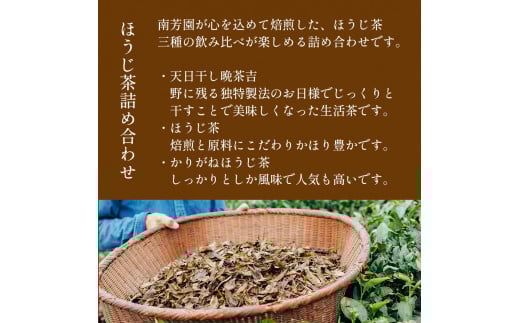 - B6 創業二〇〇余年 3種 飲み比べ ほうじ茶 詰め合わせ | 茶葉 ドリンク 飲料 お茶 日本茶 ほうじ茶 番茶 老舗 専門店 伝統 手づくり 天日干し 大和茶 独特製法 生活茶 焙煎 かりがねほうじ茶 人気 こだわり お取り寄せ ティータイム プレゼント 詰め合わせ 南芳園 奈良県 大淀町