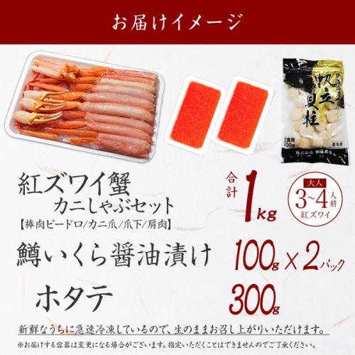 3624. 紅ズワイ 蟹しゃぶ ビードロ 1kg 鱒いくら油漬け 200g ホタテ 300g 紅ずわい 蟹 カニ 鱒 いくら イクラ ほたて 帆立 鍋 海鮮 送料無料 北海道 弟子屈町