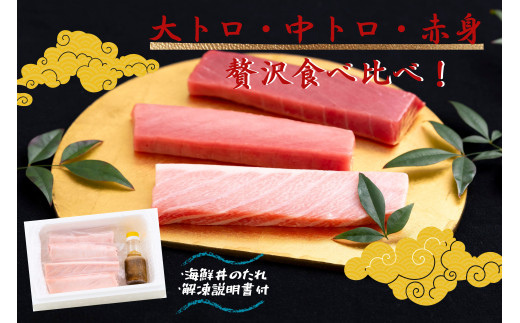 - A121p 長崎県産 本マグロ (大トロ・中トロ・赤身) 計600g以上 海鮮丼のタレ付き【本家永松家】 冷凍 真空パック マグロ まぐろ 鮪 大トロ 大とろ 中トロ 中とろ 赤身 セット 刺身 海鮮丼