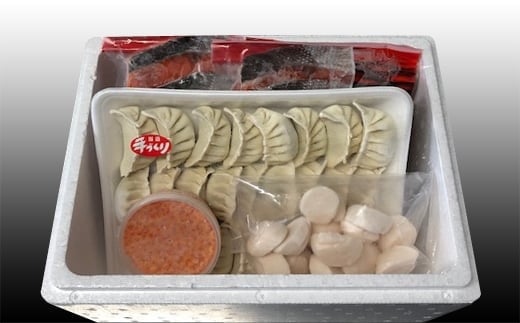 - B-76014 餃子25個、紅鮭5切×2P、いくら100g×1P、ほたて200g×1P