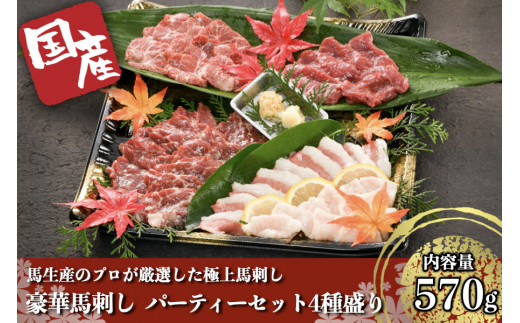 - 【国産】豪華馬刺し パーティーセット 4種盛り 熊本 馬刺し 4種 570g 盛合わせ 切れてる 特上 霜降り 上赤身 タテガミ フタエゴ 詰め合わせ セット 馬肉 馬 生食用 豪華 贈答用 ギフト JSファーム お中元 お歳暮 阿蘇 南小国町 送料無料