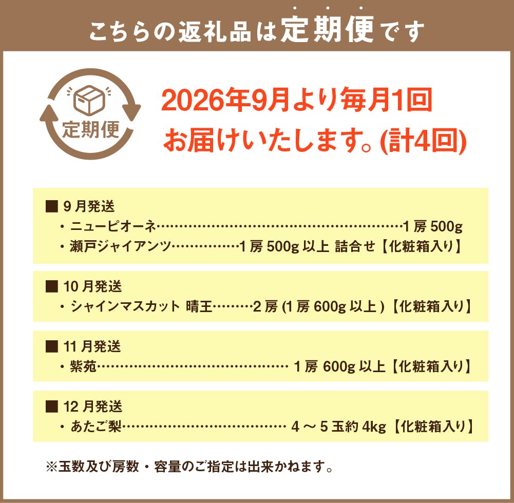 - 【ふるさと納税】【4回定期便】 岡山県産 フルーツ定期便コース 計約6.8kg 【2026年9月上旬発送開始】 ニューピオーネ 瀬戸ジャイアンツ シャインマスカット 晴王 マスカット ぶどう 葡萄 紫苑 あたご 梨 なし フルーツ 果物 くだもの 岡山県 奈義町 送料無料