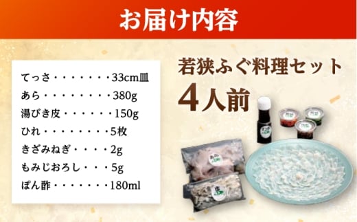 - ふぐ ふぐ鍋【着日指定可】若狭ふぐ 料理セット 4人前 冷蔵 / ふぐ フグ 河豚 てっさ テッサ 若狭フグ 若狭河豚 冷蔵 海鮮鍋 フグ鍋 河豚鍋 ふぐ刺し身 フグ刺し身 ふぐ刺し フグ刺し 河豚刺し ふぐ ふぐ鍋トラフグ とらふぐ ブランド魚 魚 海鮮 魚介 ふぐ ふぐ鍋 あら ポン酢 もみじ 鍋 ふぐちり鍋 【配送不可地域:北海道・沖縄・離島】 小浜市 / 民宿なかじま[BFBH002]