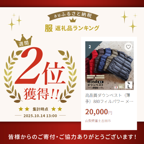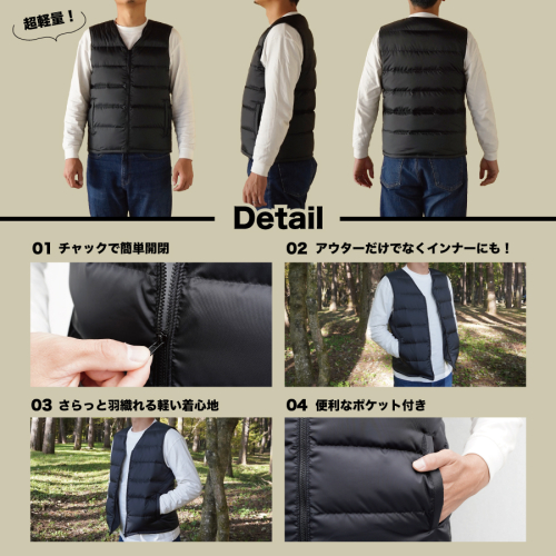 高品質ダウンベスト(薄手)880フィルパワー メンズ Lサイズ