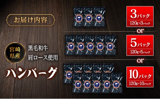 宮崎県産黒毛和牛肩ロース使用 ハンバーグ1個120g×(10パック or 5パック or 3パック)冷凍 小分け 国産【B677-A342-A341】