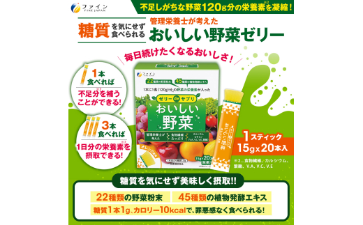 - 【ファイン】ゼリーdeサプリ おいしい野菜20包×5個セット | ゼリー サプリ 野菜ゼリー サプリメント 健康 スティックゼリー 野菜120g分 栄養素 食物繊維 カリウム カルシウム ビタミンA ビタミンC ビタミンE 野菜不足 手軽 健康維持 持ち運び便利 オレンジ風味 美味しい 食べやすい 管理栄養士監修 日本製 ISO9001認証 野菜摂取 手軽 兵庫県 上郡町