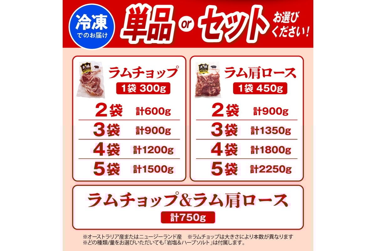 生ラム肩ロース300g、生ラムショルダー300g、ラムショルダーロール600g(味付けなし300g、味付けあり300g)