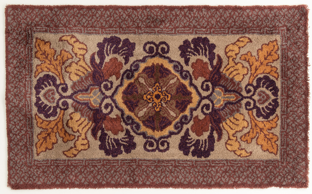 【鍋島緞通吉島家】鍋島緞通/手刺繍 蟹牡丹文縁七宝 茶地桑色