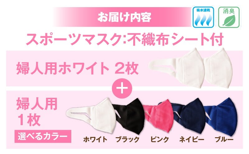 スポーツマスク(伸縮素材使用の日本製マスク)婦人用ホワイト×2枚+婦人用1色×1枚セット | 婦人用 スポーツ スポーツマスク ホワイト 速乾性 消臭機能付き 日本製 ギフト プレゼント 職人 手作り 香川県 伸縮素材 国内 国産 レガン おすすめ |_mk020-025