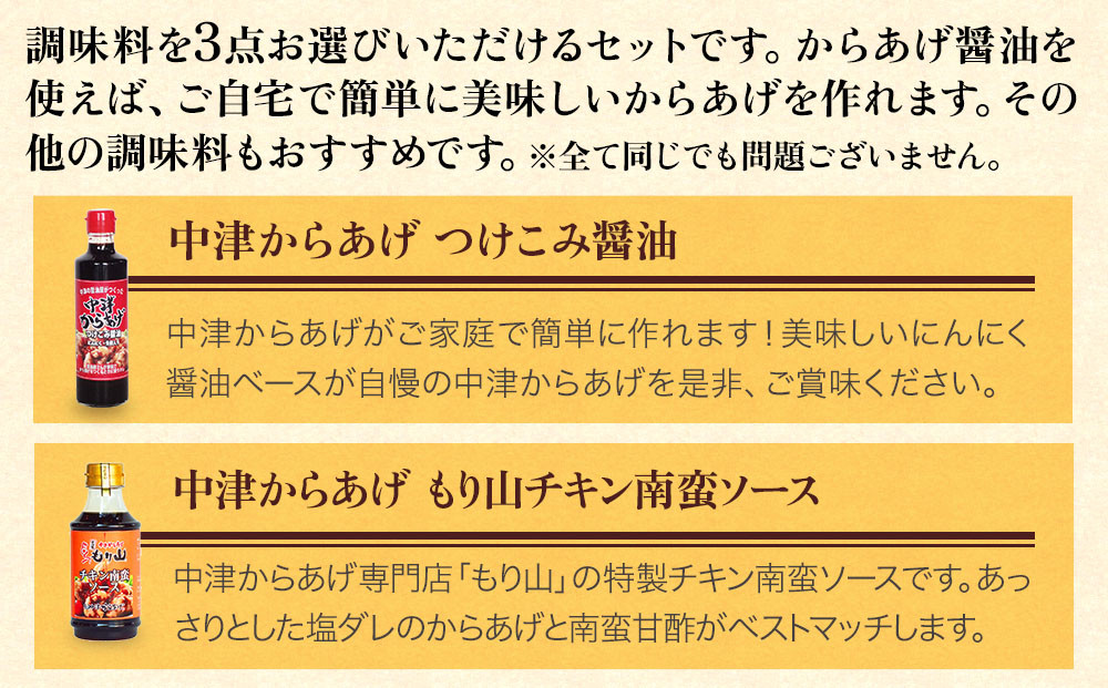 - 蔵工房・二反田醤油 調味料お選び3点セット | 調味料 中津からあげ漬け込み醤油 もり山チキン南蛮ソース から揚げげソース柚子・にんにく 柚子胡椒 合わせ味噌 米麹味噌 万能ソース 醤油 しょうゆ 味噌 ソース セット 大分県 中津市