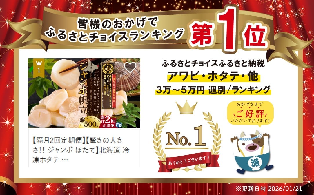 - 御礼!ランキング第1位獲得!【隔月2回定期便】【驚きの大きさ!! ジャンボ ほたて】北海道 冷凍ホタテ 貝柱 ジャンボホタテ500g ( 北海道 野付 ほたて ホタテ 帆立 貝柱 人気 特大 大玉 大 訳あり ふるさとチョイス 仕組み キャンペーン 限度額 計算 ランキング やり方 シミュレーション チョイス チョイスマイル 大容量 )