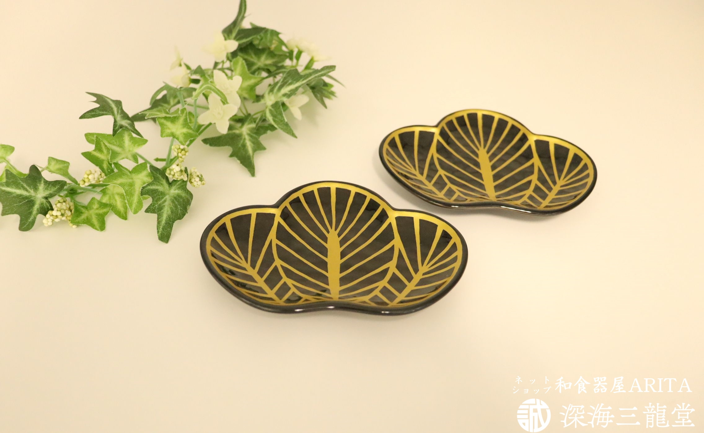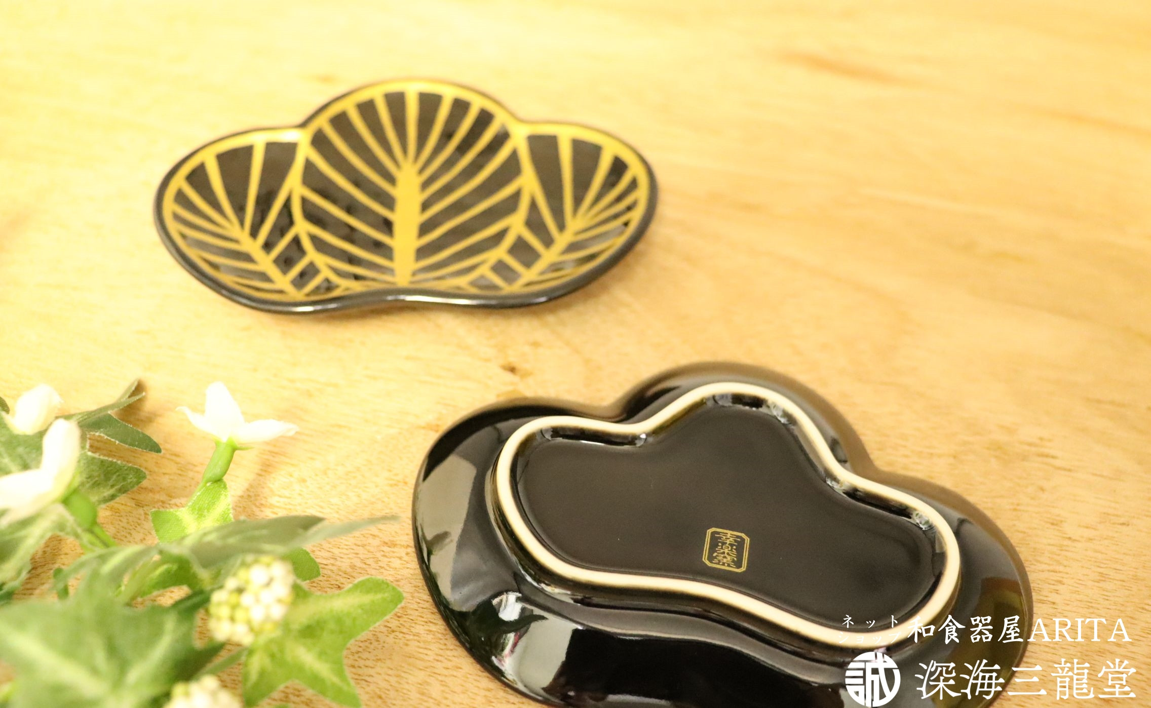 - 有田焼 招福銘々皿2枚組 / 黒松(幸楽窯 / 深海三龍堂)お皿 小皿 菓子皿 取り皿 ハレの日 松葉 縁起物 お正月 A17-9