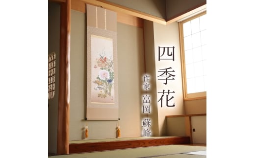 - 掛け軸「四季花」 富岡蘇峰 尺五立 サイズ:54.5×190cm 桐箱付 掛け軸 表装 床の間