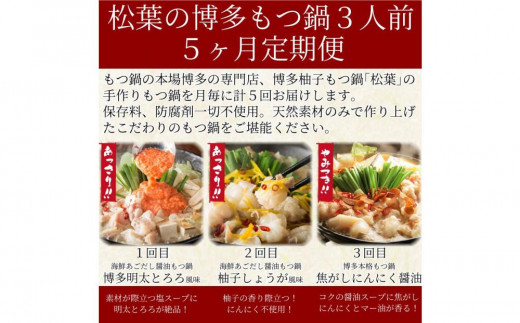 - 松葉の本格もつ鍋「博多もつ鍋5種の味食べ比べ!5ヶ月定期便」2人前~3人前【海鮮あごだし醤油(明太とろろ風味)・海鮮あごだし醤油(柚子しょうが風味)・焦がしにんにく醤油・海鮮あごだし醤油(トムヤムクン風味)・海鮮あごだし醤油(玄海塩風味)】