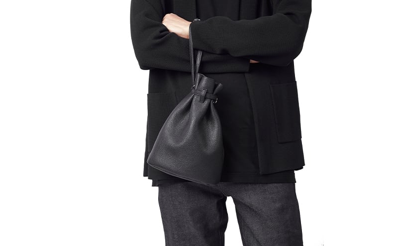 - ソフトシュリンクレザー 巾着ポーチ 小物 巾着 ポーチ 底マチ ブラック グレー 牛革 レザー 東京都 文京区 [№5338-0435]