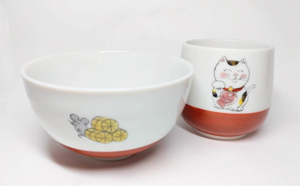 九谷焼 飯椀・湯呑セット 猫とネズミ