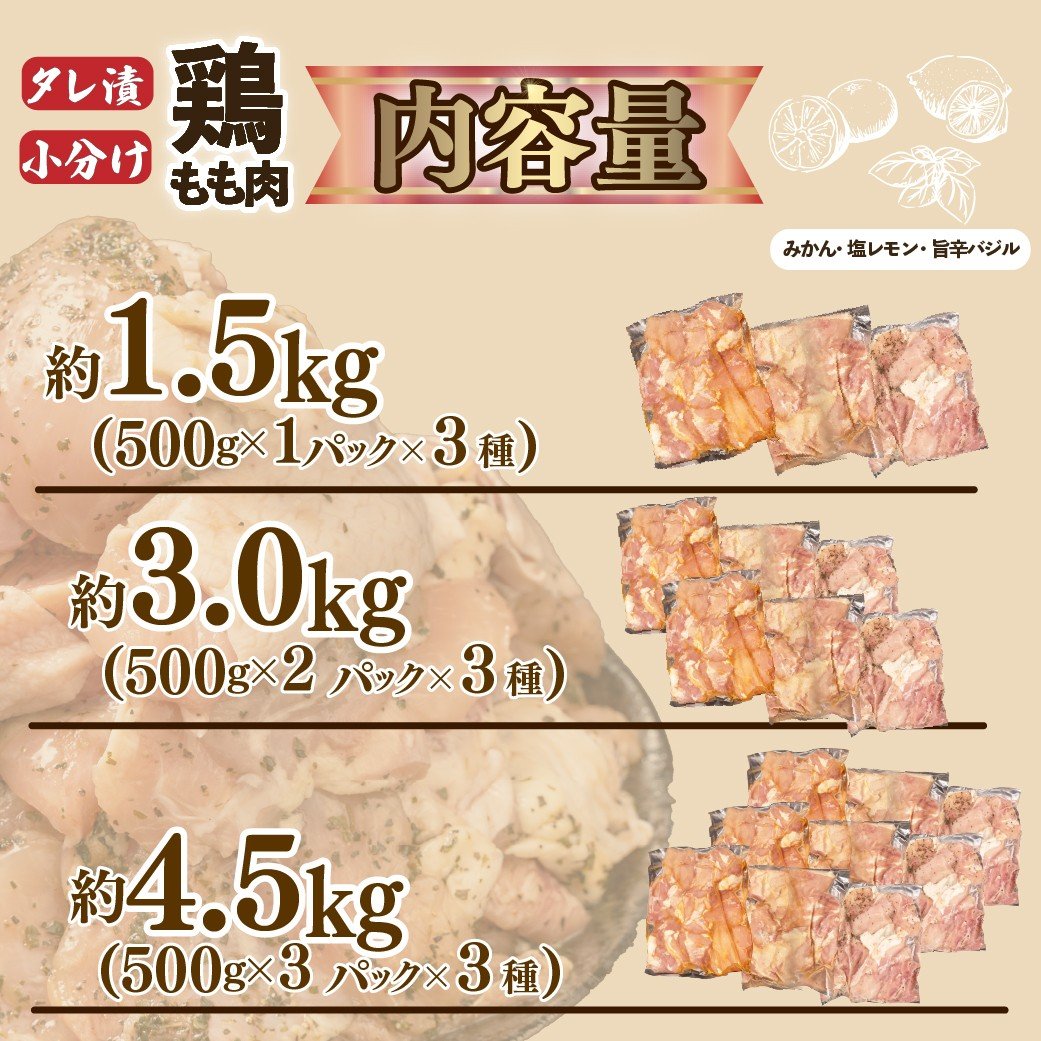 - 鶏もも肉 500g×3~9パック 計1.5~4.5kg 鶏肉 鶏もも もも肉 タレ漬け 食べ比べ みかんタレ 塩レモンタレ 旨辛タレ 冷凍ストック
