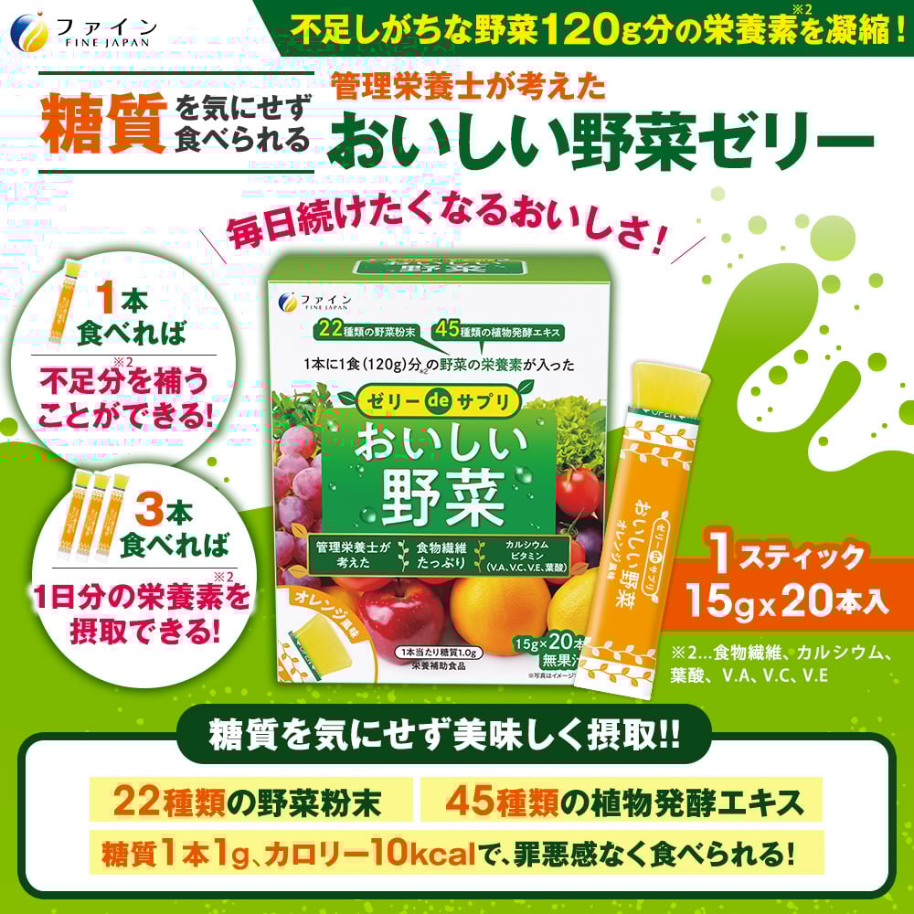 - 【ファイン】ゼリーdeサプリ おいしい野菜20包 | ゼリー サプリ 野菜ゼリー サプリメント 栄養補助食品 健康 スティックゼリー 野菜120g分 栄養素 食物繊維 カリウム カルシウム ビタミンA ビタミンC ビタミンE 野菜不足 手軽 健康維持 持ち運び便利 オレンジ風味 美味しい 食べやすい 管理栄養士監修 日本製 ISO9001認証 野菜摂取 手軽 兵庫県 上郡町