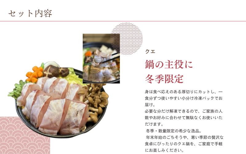 - クエ鍋用セット(切り身400g+アラ200g)【冬季限定・数量限定】【小分け冷凍】【養殖・冷凍】|和歌山県串本町大島から直送 / クエ鍋 鍋 魚 高級魚 海鮮【oos002】