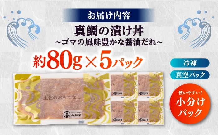 【在庫処分のため寄附額見直し】真鯛のゴマ醤油だれ 漬け丼 約80g×5パック / 真鯛 マダイ 鯛 醤油 タレ 漬け 魚 海鮮 丼ぶり 小分け パック 冷凍 【株式会社サンマリン】 [ATHA001]