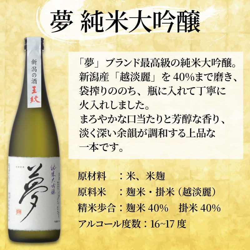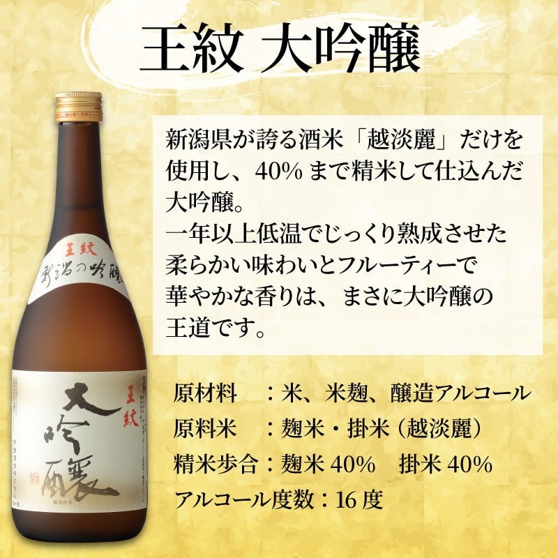 - 王紋酒造 珠玉のセット 選べる 容量 720ml×2本 1.8L×2本 王紋 大吟醸 夢 純米大吟醸 飲み比べ 新潟 日本酒 酒 お酒 地酒 食中酒 四合瓶 飲みくらべ ペアリング ギフト プレゼント 御歳暮 贈答 贈り物 年末年始 新潟県産 米 新潟県 新発田市 新発田 aumont001P