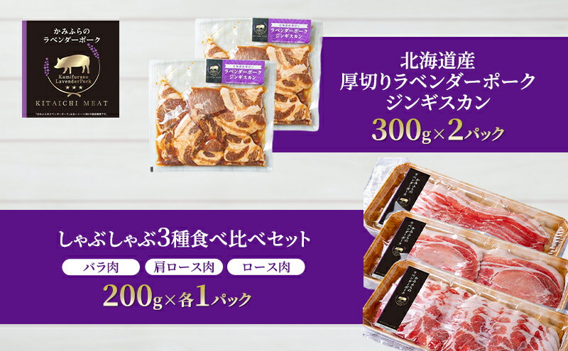 【ふるさと納税】【北一ミート】かみふらの ラベンダーポーク☆デリシャスセット [しゃぶしゃぶ 3種&ジンギスカン]計1.2kg ( ラベンダーポーク 豚肉 豚 冷凍 国産 スライス しゃぶしゃぶ バラ肉 肩ロース肉 ロース ジンギスカン 北海道 上富良野町 )