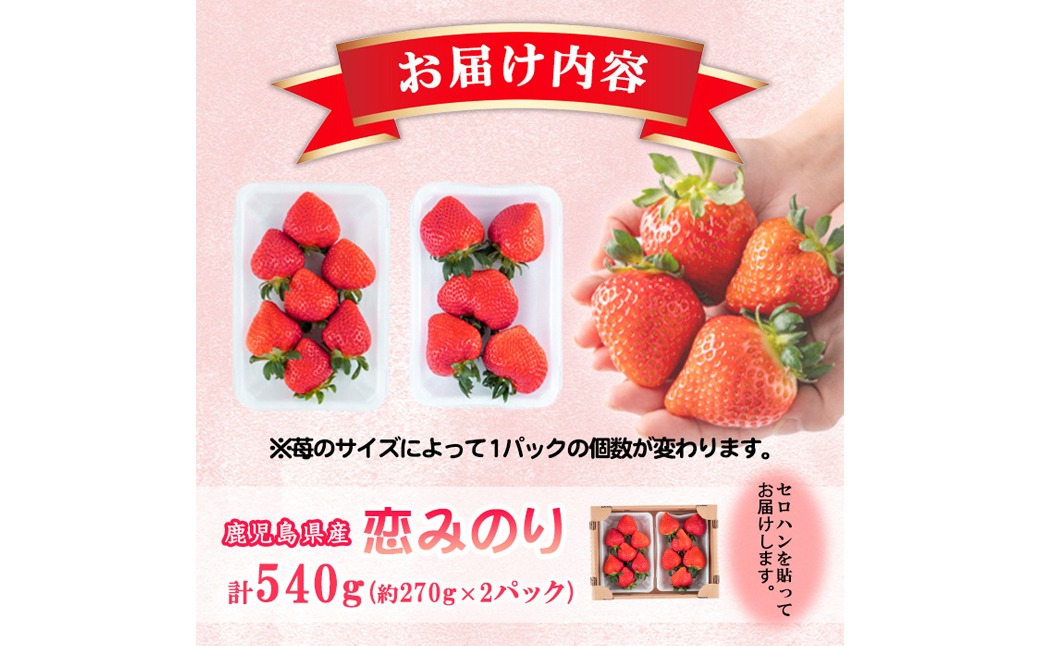 【数量限定】鹿児島県産朝採れイチゴ「恋みのり」約540g(約270g×2パック) p7-048
