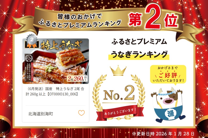 - ランキング第2位獲得!(6月発送)国産 特上うなぎ 2尾 合計 260g 以上【OT000O130_006】
