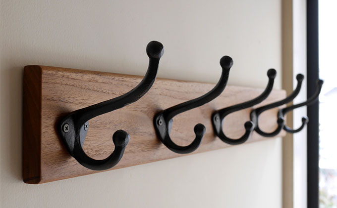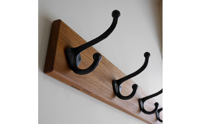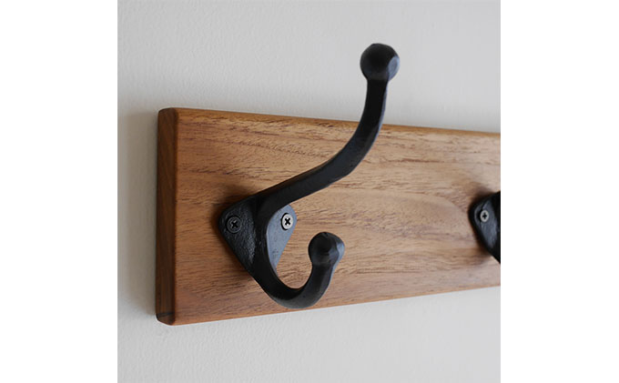 無垢チーク材&5連大きなアイアンダブルフックのウォールコートハンガー 85cm (ウォールフック,帽子掛け,コート掛け,玄関,家具) 雑貨 日用品 インテリア ウォールハンガ 天然無垢木材