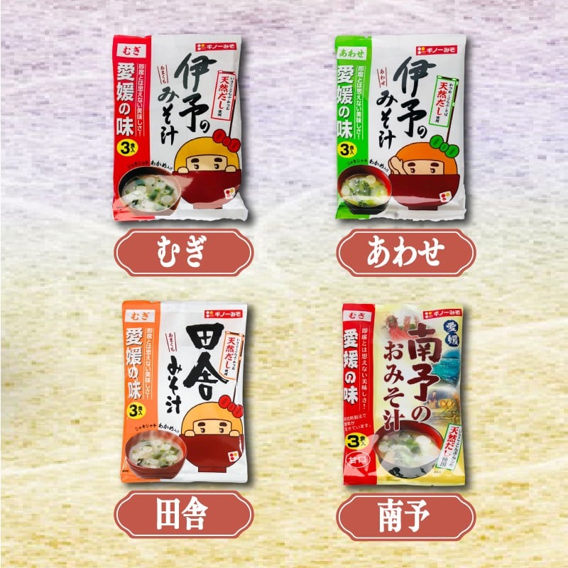 - 【選べる】即席みそ汁セット 4種(12食入り)| 即席 レトルト 味噌 味噌汁 みそ汁 簡単 便利 具だくさん 食べ比べ 父の日 一人暮らし 減塩 低塩 麦みそ 国産 大麦 大豆 味噌 みそ 粒みそ 調味料 麹 こうじ 味噌汁 みそ汁 愛媛県 松前町 えひめけん まさきちょう ギノーみそ