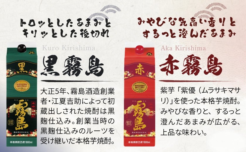 霧島酒造「赤・茜・黒・EX」パック(25度)1.8L×4本_22-19-009_(都城市) 本格芋焼酎 1800mlパック焼酎 赤霧島 茜霧島 黒霧島 黒霧島EX(各1本) 芋焼酎 アルコール度数 25度 お酒 飲み比べ
