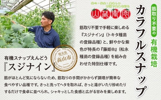 - 春の食卓を彩る 飛騨高山産 有機栽培スナップエンドウ 1kg(緑色・紫色の混合)(春限定・5〜6月発送)|新鮮 春野菜 旬の味覚 えんどう 彩り野菜 山藏農園 JC020