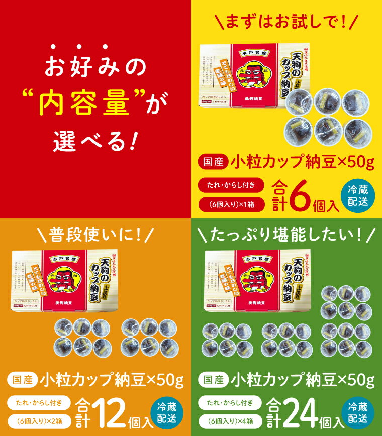 - 【ふるさと納税】【選べる個数】【天狗納豆】国産小粒カップ納豆(50g×6個)×1・2・4箱【納豆 なっとう 小粒 老舗 朝食 ご飯 ご家庭用 おためしサイズ ソウルフード 水戸市 水戸 茨城県】(DQ-15)