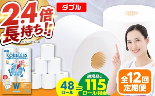 - 【全12回定期便】長持ち! トイレットペーパー ダブル 長巻き 65m 6ロール×8パック エコ ワンタッチ コアレス《豊前市》【大分製紙】 [VAA024] 備蓄 防災 まとめ買い 日用品 消耗品 常備品 生活用品 大容量 トイレ