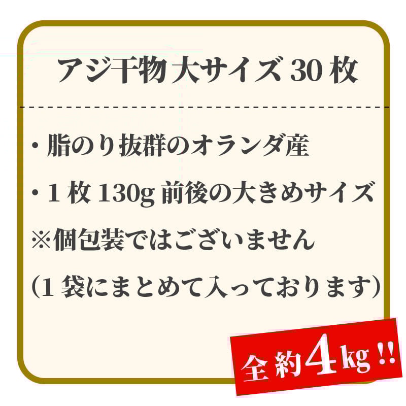 アジ 干物 大きめ 約4kg 30枚 1枚 あたり 130g前後 あじ 開き 鯵 あじ ひもの アジ 晩酌 アジ おつまみ 天然 あじ 簡単 お手軽 魚 魚介 干し アジ 干しもの 干し魚 美味しい 極上 静岡 沼津 静岡県