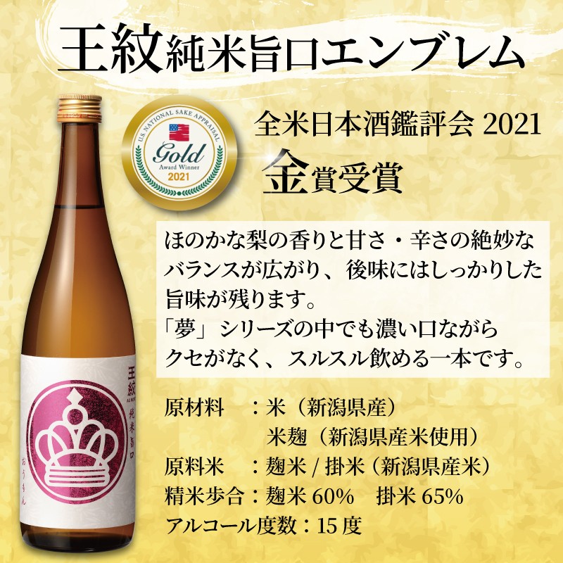 - 王紋酒造 金賞受賞酒飲み比べ 720ml 3本 トリプルゴールド セット 新潟 酒 受賞 純米酒 夢 純米吟醸 山廃純米 純米旨口 エンブレム 四合瓶 飲み比べ 飲みくらべ 日本酒 お酒 地酒 食中酒 ペアリング ギフト 贈答 プレゼント 王紋 新潟県 新発田市 新発田 aumont003_01