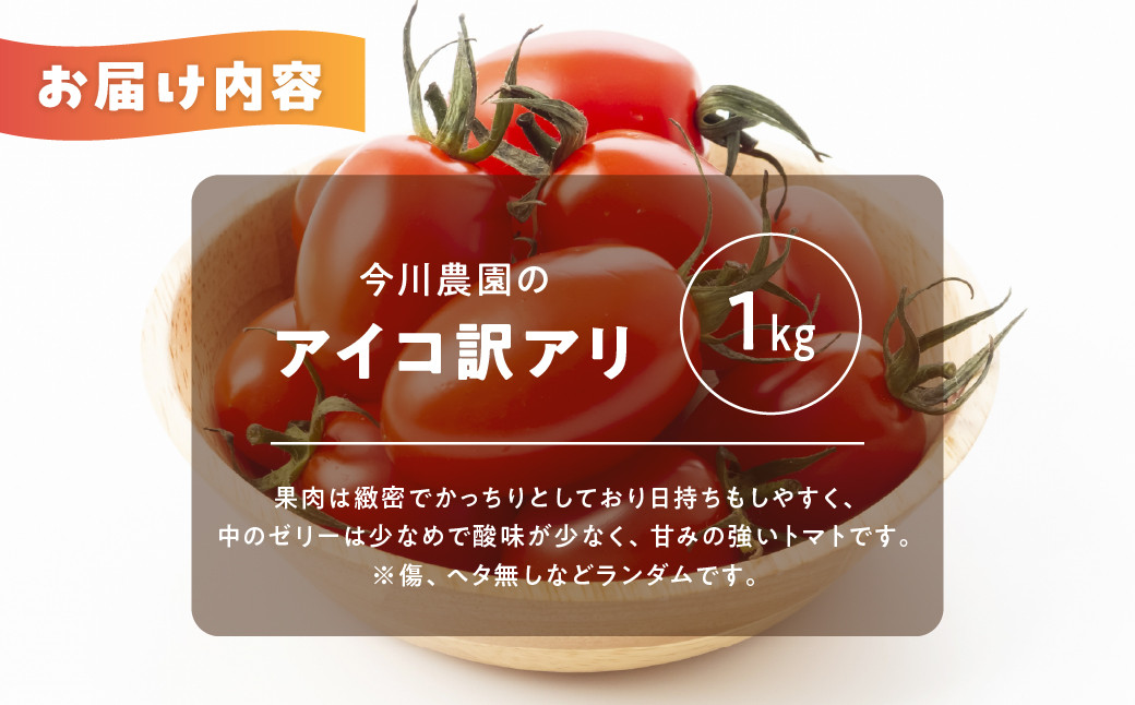 - 【ふるさと納税】【先行予約】今川農園のミニトマト 訳ありアイコ 1kg 先行予約受付 期間限定 季節限定 野菜 国産 完熟 やさい フルーツ トマト 完熟 千果 ミニトマト イエロー プチトマト イエロートマト プチ お弁当 贈り物 おやつ サラダ 送料無料 産地直送