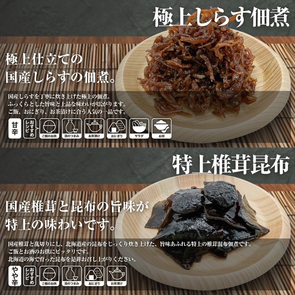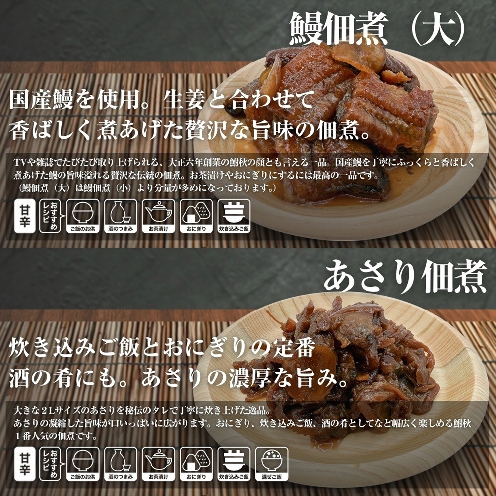 - 鮒秋 佃煮 8個詰め合わせ Cセット《 鰻佃煮(大) あさり佃煮 極上いかあられ ほたるいか佃煮 ハラペーニョ佃煮 ちりめん山椒 極上しらす佃煮 特上椎茸昆布 》|TVで紹介されました 大正6年創業 老舗佃煮専門店 鮒秋の秘伝のたれで旨みを閉じ込め炊き上げた佃煮 ご飯のお供 おにぎり お茶漬け おつまみ 佃煮セット ギフト 贈答 父の日 母の日 敬老の日 お返し 内祝い 新築 [1266]