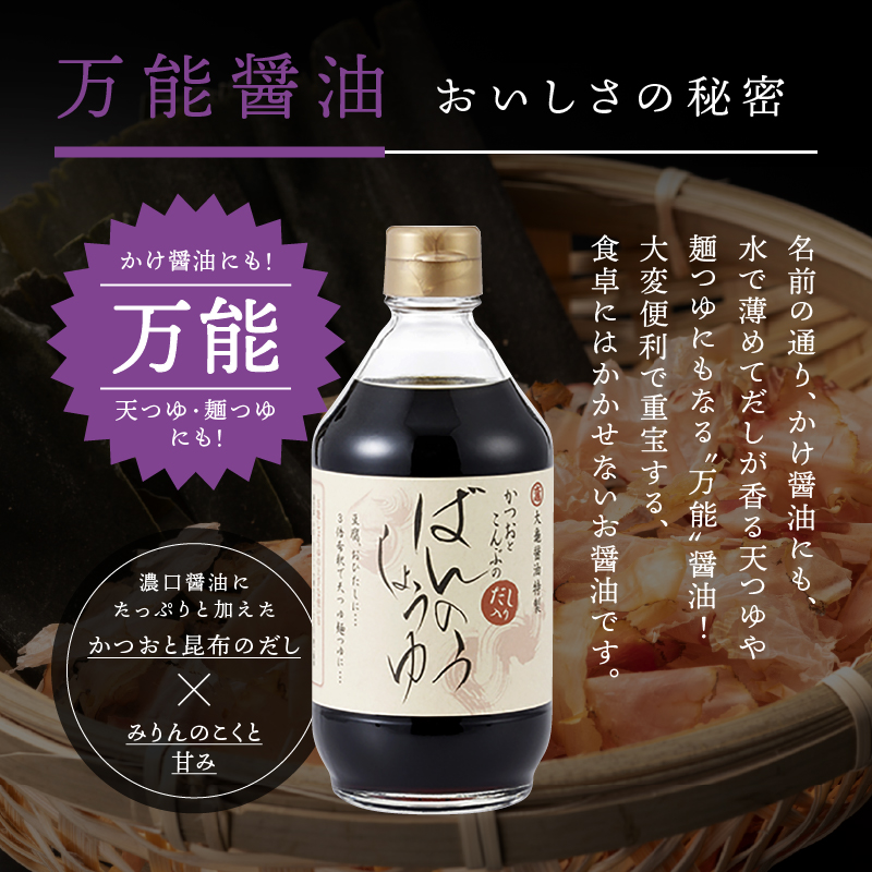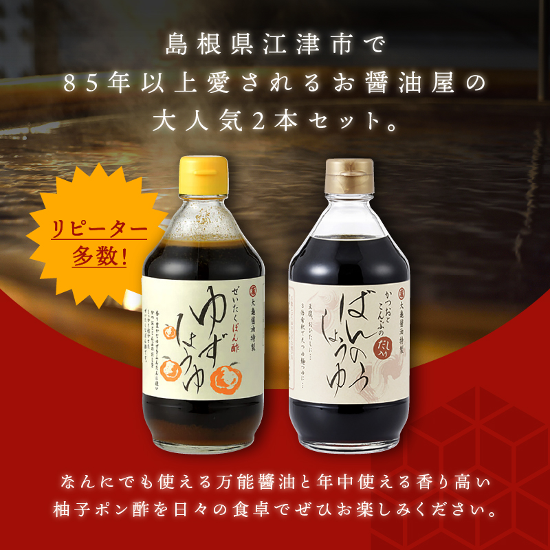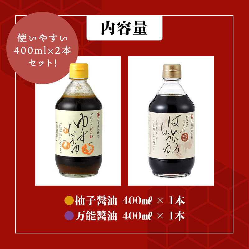 大亀醤油 柚子醤油(400ml)と万能醤油(400ml) 2本セット【YS-3】|送料無料 大亀醤油 国産 醤油 しょうゆ しょう油 柚子醤油 柚子 万能醤油 万能 調味料 加工品 料理 調理 食べ物 食品 常温 常温保存 保存 一年中大活躍 コク 色々な料理に 重宝 プレゼント|